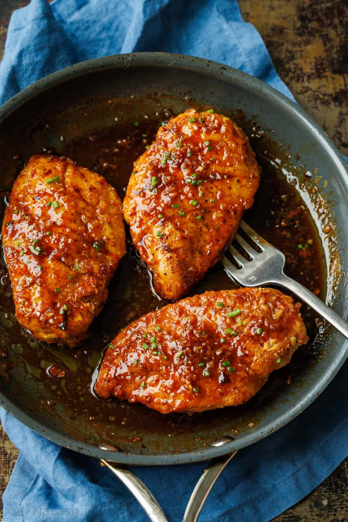- Make the Glaze – add the remaining butter and garlic and stir for 30 seconds or until fragrant. Add honey, soy sauce, and apple cider vinegar. Stir and simmer the sauce for 2-3 minutes until thickened, spooning it over the chicken as it cooks. When the chicken is cooked through (165°F), remove it from the heat.