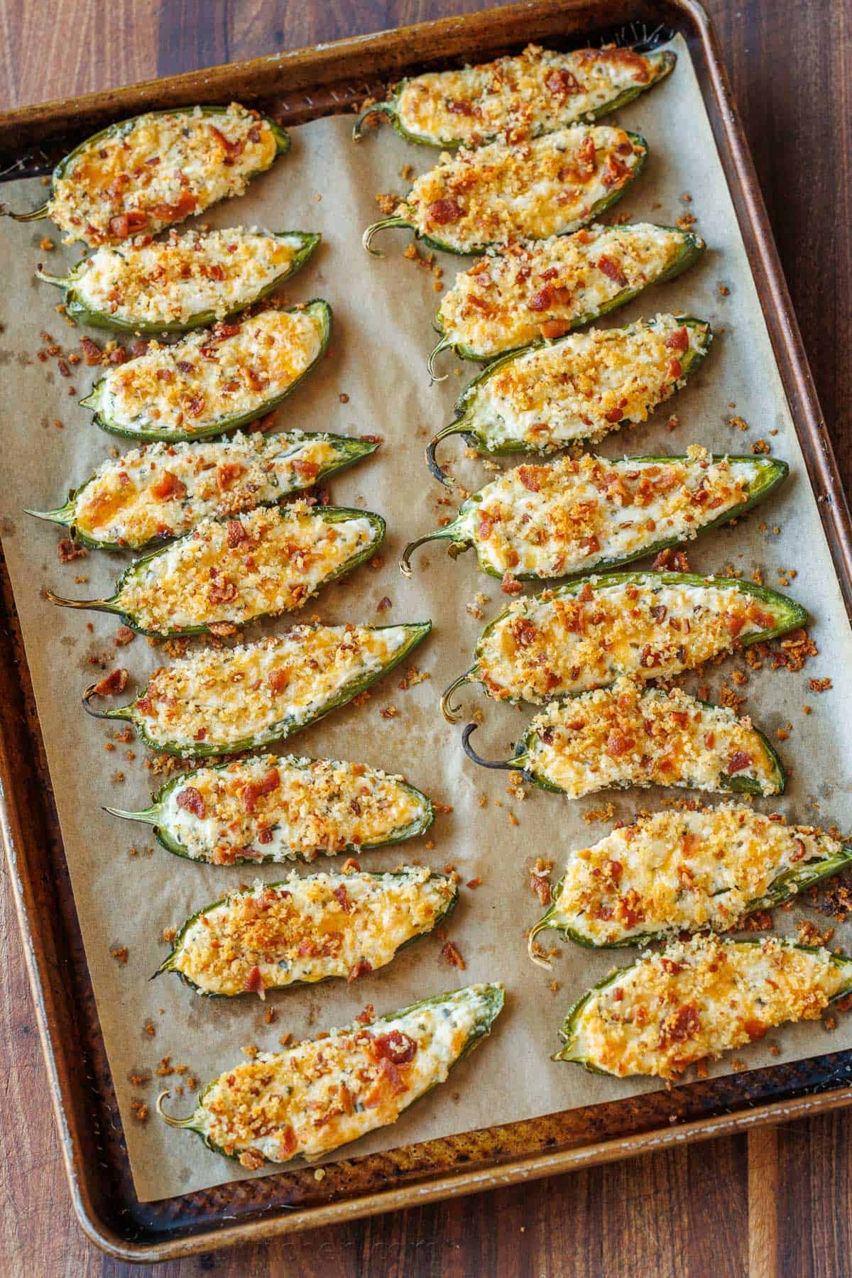 jalapeno poppers with crunchy topping on a lined sheet pan